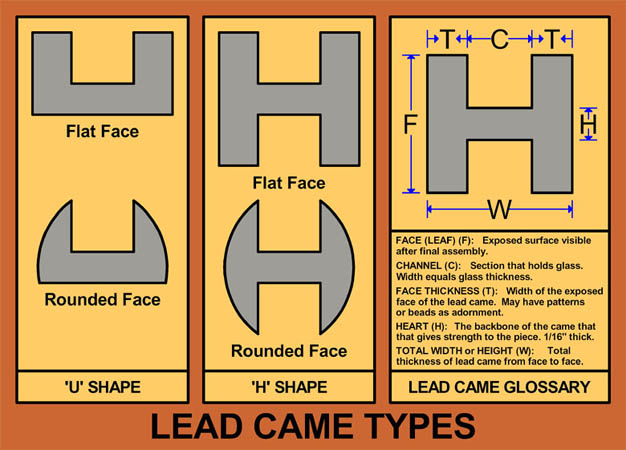 Lead Came: The old traditional lead came method uses extruded or milled lead strips that are channeled into an 'H' shape into which are inserted two adjoining glass pieces. The pieces are soldered at the joints and cemented in place. The lead came holds the pieces together and after cementing gives structural strength to the window. It comes in rolls or strips of different widths.