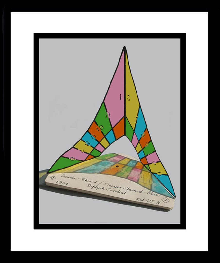 Maker: Robert Terwilliger, USA Date: 1994 Original Location: Lat: 40º N. (but it’s adjustable) Present Location: At maker's location Orientation: South facing dial has two faces oriented SE and SW Size: Model is 5 1/2" without column, If built to full size, receiving surface would be about 2-3 feet below eye level. Adornment: none Mottos: none Condition: Original felt tip pen coloring is now faded. Comments: This type of dial was recently invented in 1994 by Dutch dialist Thibaud Taudin-Chabot. There are no known full-scale examples of this extremely rare sundial type installed anywhere! When lit by the sun, the sundial face on the glass projects its image onto a receiving surface. In a building, this could be a wall or a floor. The sundial doesn't have a fixed gnomon attached. Instead, the gnomon is simply a dot on the receiving surface. As the sun moves across the sky, the projected sundial image moves across the receiving surface. The location of the dot gnomon on the projected image indicates the correct time and can also indicate the date.The lack of a three dimensional gnomon makes this type of dial more resistant to damage. Projection dials must have transparent glass or plastic that's colored or clear. They can't have translucent opalescent glass. This is a plastic stand-alone dial. 1/4" foam board Image projection receiving surface has rounded brass nail head nodus.Dial is horizontal or angled on a plinth. Tells time, equinoxes and solstices. Time says 2:30 on this dial and the date is early fall. Based on original concepts by Fred Sawyer and Thibaud Taudin-Chabot. Article by Fred Sawyer: (August 1994) A Stained Glass Diptych Pattern. "The Compendium" Vol. 1-3 pgs. 6-8 NASS. Article by Robert Terwilliger: (pen Name: Ave Amici. L. Papirius Cursor) (March 1995). Ave Amici. "The Compendium" Vol. 2-1 pg. 12 NASS. Article by Thibaud Taudin-Chabot: (August 1994) A Transparent Window Dial. "The Compendium" Vol. 1-3 pgs. 6-8 NASS. Twig’s Digs Website: Here Robert Terwilliger’s Email: Here Thibaud Taudin-Chabot’s Email: Here Photo Descriptions: Photo is courtesy of Thibaud Taudin Chabot and has been heavily restored using Photoshop. Photos: a |
