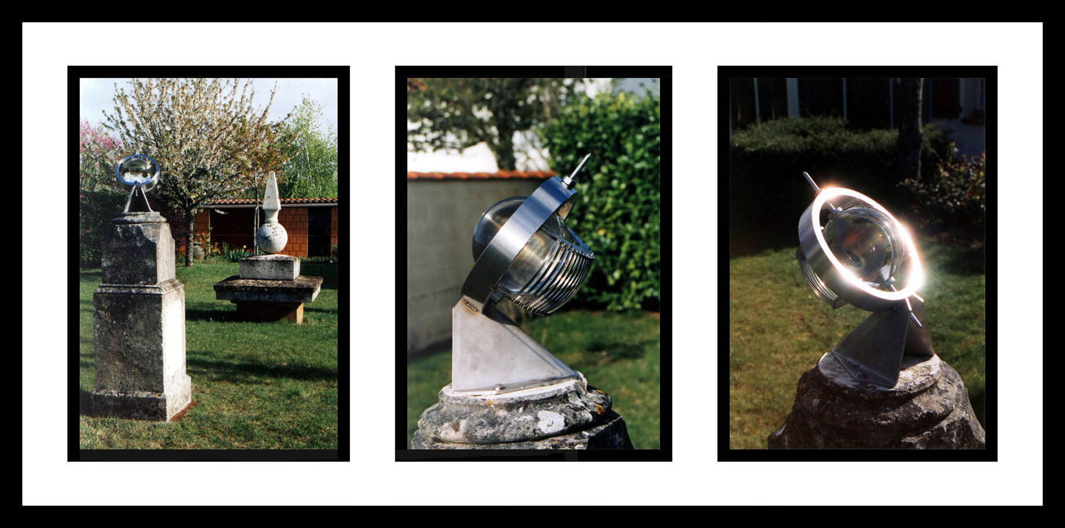 Designer & Maker: Claude Guicheteau Date: April 2003 Original Location: Latitude and longitude are unknown, but dial was designed for Aiffres 79230, France Present Location: at original location Orientation: equatorial with polar axis Size: sphere diameter- 15 cm (6 in) Adornment: none visible Mottos: none are visible Condition: unknown Comments: modern rendition of an equatorial sundial based on a design described in 1778 by Jacques Ozanam, mathematician of king Louis XIV, that used a glass ball of water to focus the sun's rays so that they successively heat up the various hour bars - thus making it possible for someone who is blind to tell the time by touch. This modern version uses a solid glass sphere instead of water-filled sphere. References: "The Mathematical Recreations" (1778). Serial of exercises in all the scientific domains at that time: mechanics, astronomy, and chemistry in 3 or 4 volumes. In the gnomonique section, an exercise is suggested making a sundial for blind person. Website: Here Design Article (French): Here Design Article (Rough English Translation): Here Photo Descriptions: Photos are courtesy of Claude Guicheteau. Photos: a b c |