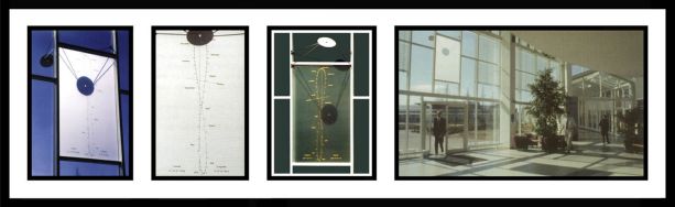 | Dial Designer: René Rioux Glass Artisans: Michèle Lapointe & René Rioux Date: 1995 Original Location: Lat: 45.49° N. Lon: 73.88° W. Bibliothèque Municipale, Ile Bizard (Public library, Bizard Island), Québec Canada Present Location: at original location Orientation: Vertical. Declines south Size: Gnomon length- 3m (118 in), Dial- 1.8 x 3.75 m (5.9 x 12.3 ft.) Adornment: decorative irregular glass shapes, arrows, lines and dots. Mottos: none Condition: excellent Comments: This is the largest known glass sundial in the world and oldest known Canadian glass sundial. It has alternating wide and thin clear plate glass vertical sections that are sandblasted and joined together. UV acrylic glue was used to attach brass bars and pieces of colored stained waterglass. Numerals are metal strips positioned beneath etched chapter ring. Arrows are hourlines. Small parts from old clocks and appliances are used. This work of modern art was named: "et pourtant, elle tourne" (and yet, it turns), and probably quotes Galileo recanting the recantation of his heresy following the Papal Inquisition. The simple geometrical forms point to pre-Copernican theories of the cosmos. And, in memory of Galileo, the distribution of mural's elements isn't done as the arc of circle, but as the elliptic trajectory of the earth's orbit. Michèle Lapointe Website: Here Michèle Lapointe & René Rioux Website: Here Ile-Bizard Website: Ile-Bizard Michèle Lapointe & René Rioux Email: Here Photo Descriptions: Photos are courtesy of Michèle Lapointe & René Rioux. Photos: a b c d e f g h i j |