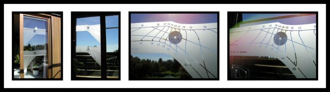 | Designer: Dietrich Ahlers Maker: Glaserei Oelze Bremen (auf Fensterglas geästzt) Date: unknown. Probably 2004 Original Location: Lat: 52° 59' 0" N, Lon: 8° 48' 19" E. At Angelser Field 3, 28844 Weyhe, Germany. Present Location: at original location Orientation: Vertical. Declines 33° to the west of south. Size: unknown Adornment: Dial faces have split half analemmas with 1st of the month date marks, solstice hyperbolas and an equinox line. The upper dial also has a curve for May 8, Mr. Ahler's birthday. Both dials have two time scales: hour numerals on top tell Central European Time, and bottom numerals tell Central European Summer Time. Mottos: none Inscriptions: Top Dial: Dec. 21 to Jun 21; Bottom Dial: Jun 21 to Dec 21 Condition: excellent Comments: Balcony door window panel has two separate sundials etched into an inner glass pane. Each dial has hourly split analemmas for half a year that permit Standard Mean Time readings. Both gnomon disks have aperature holes. These are etched onto the outer pane and project spots of light onto the dial faces on the inner pane. Olbers Planetarium at the University of Bremen Website: Here Dietrich Ahlers’ Email: Here Photo Descriptions: Photos are courtesy of Dietrich Ahlers. Photos: a b c d |